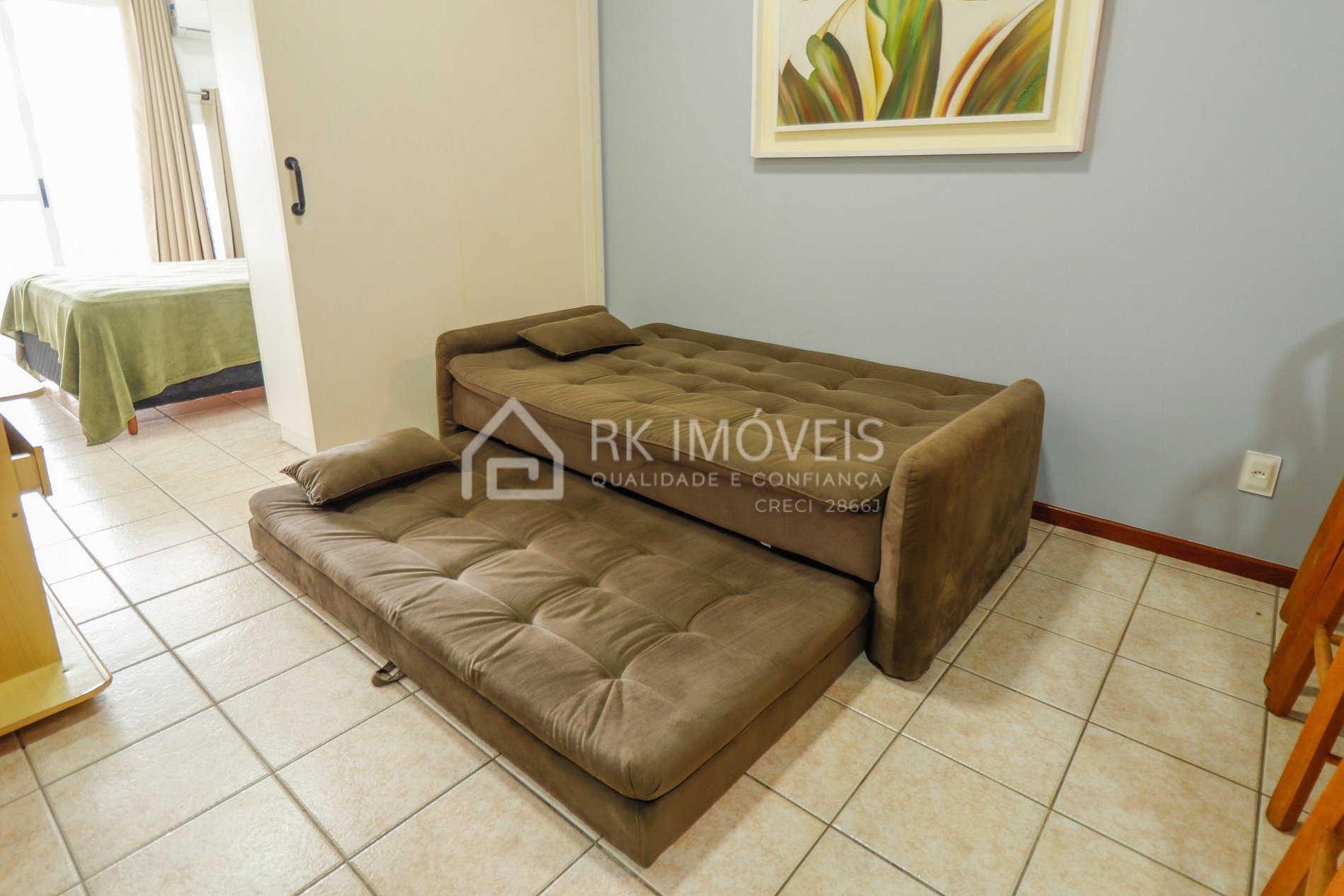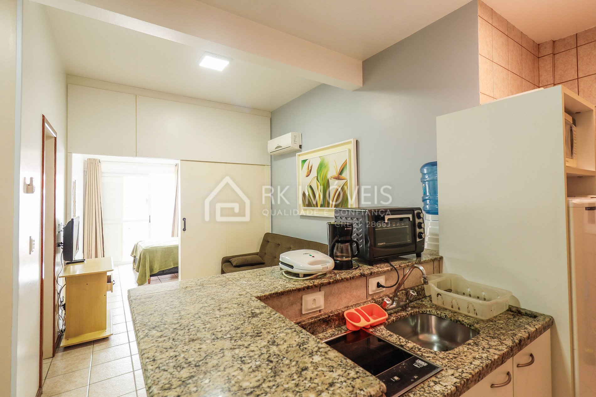 Apartamento Luxo - 1 dormitório com cama de casal, ar condicionado, sala com bicama e cozinha americana, 1 banheiro e sacada com churrasqueira